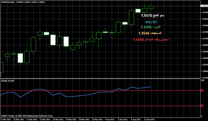 - عندما يكون مؤشر القوة النسبية اعلى من 70، قم بالشراء مع فتح اول بار او اول شمعة بالاضافة الى 20 بيب.