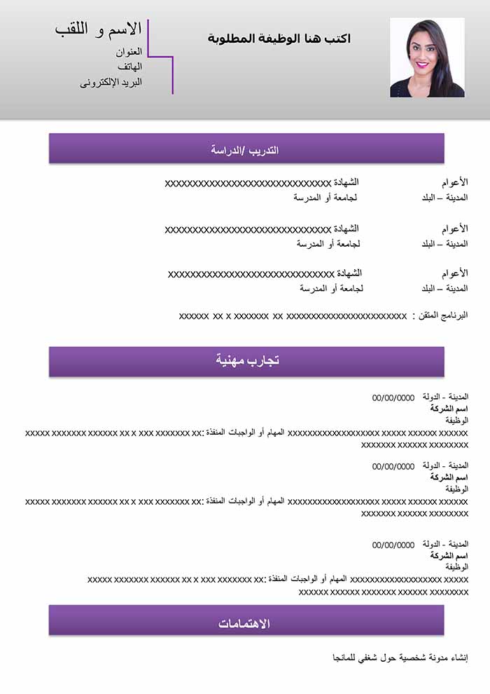 هذا نموذج من السيرة الذاتية مجاني و قابل للتحميل و التعديل مثالي لكل نوع من ملفات الوورد . تسليط الضوء على المهارات سيمثل ميزة مهمة . سواء كنت طالب ، مدير أو موظف، هذا النموذج من السيرة الذاتية المجاني قادر بالتأكيد على التأقلم مع احتياجاتك. هذا النوع من السير الذاتية مثالي لتقديم تجاربك المهنية. كما يحتوي أيضاً على فقرة في أعلى السيرة الذاتية للإشارة إلى نقاط قوة ملفك. فكر في اختيار عبارة لفت إنتباه جيدة لبدء هذه الفقرة. و إذا كنت ترغب في الحصول على سيرة ذاتية باللغة الإنجليزية، قم بتنزيل هذه السيرة الذاتية و ترجمة الأقسام المختلفة.