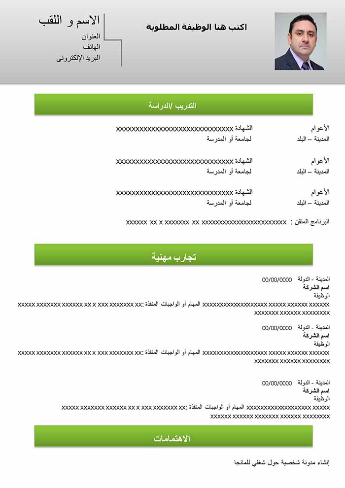 هذا نموذج من السيرة الذاتية مجاني و قابل للتحميل و التعديل مثالي لكل نوع من ملفات الوورد . تسليط الضوء على المهارات سيمثل ميزة مهمة . سواء كنت طالب ، مدير أو موظف، هذا النموذج من السيرة الذاتية المجاني قادر بالتأكيد على التأقلم مع احتياجاتك. هذا النوع من السير الذاتية مثالي لتقديم تجاربك المهنية. كما يحتوي أيضاً على فقرة في أعلى السيرة الذاتية للإشارة إلى نقاط قوة ملفك. فكر في اختيار عبارة لفت إنتباه جيدة لبدء هذه الفقرة. و إذا كنت ترغب في الحصول على سيرة ذاتية باللغة الإنجليزية، قم بتنزيل هذه السيرة الذاتية و ترجمة الأقسام المختلفة.