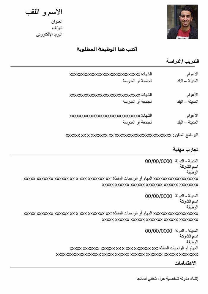 هذا نموذج من السيرة الذاتية مجاني و قابل للتحميل و التعديل مثالي لكل نوع من ملفات الوورد . تسليط الضوء على المهارات سيمثل ميزة مهمة . سواء كنت طالب ، مدير أو موظف، هذا النموذج من السيرة الذاتية المجاني قادر بالتأكيد على التأقلم مع احتياجاتك. هذا النوع من السير الذاتية مثالي لتقديم تجاربك المهنية. كما يحتوي أيضاً على فقرة في أعلى السيرة الذاتية للإشارة إلى نقاط قوة ملفك. فكر في اختيار عبارة لفت إنتباه جيدة لبدء هذه الفقرة. و إذا كنت ترغب في الحصول على سيرة ذاتية باللغة الإنجليزية، قم بتنزيل هذه السيرة الذاتية و ترجمة الأقسام المختلفة.