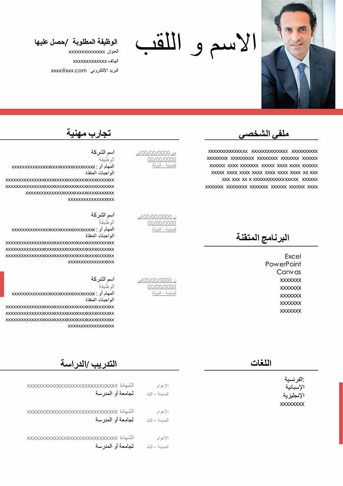 هذا نموذج من السيرة الذاتية مجاني و قابل للتحميل و التعديل مثالي لكل نوع من ملفات الوورد . تسليط الضوء على المهارات سيمثل ميزة مهمة . سواء كنت طالب ، مدير أو موظف، هذا النموذج من السيرة الذاتية المجاني قادر بالتأكيد على التأقلم مع احتياجاتك. هذا النوع من السير الذاتية مثالي لتقديم تجاربك المهنية. كما يحتوي أيضاً على فقرة في أعلى السيرة الذاتية للإشارة إلى نقاط قوة ملفك. فكر في اختيار عبارة لفت إنتباه جيدة لبدء هذه الفقرة. و إذا كنت ترغب في الحصول على سيرة ذاتية باللغة الإنجليزية، قم بتنزيل هذه السيرة الذاتية و ترجمة الأقسام المختلفة.