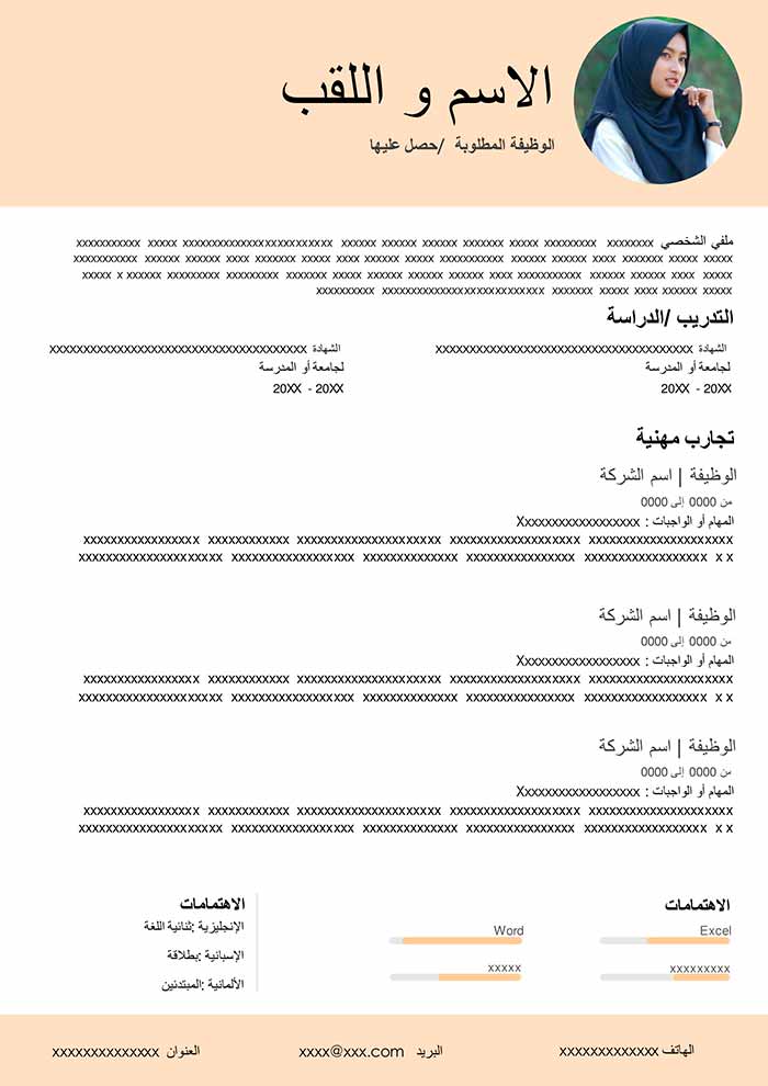 هذا نموذج من السيرة الذاتية مجاني و قابل للتحميل و التعديل مثالي لكل نوع من ملفات الوورد . تسليط الضوء على المهارات سيمثل ميزة مهمة . سواء كنت طالب ، مدير أو موظف، هذا النموذج من السيرة الذاتية المجاني قادر بالتأكيد على التأقلم مع احتياجاتك. هذا النوع من السير الذاتية مثالي لتقديم تجاربك المهنية. كما يحتوي أيضاً على فقرة في أعلى السيرة الذاتية للإشارة إلى نقاط قوة ملفك. فكر في اختيار عبارة لفت إنتباه جيدة لبدء هذه الفقرة. و إذا كنت ترغب في الحصول على سيرة ذاتية باللغة الإنجليزية، قم بتنزيل هذه السيرة الذاتية و ترجمة الأقسام المختلفة.