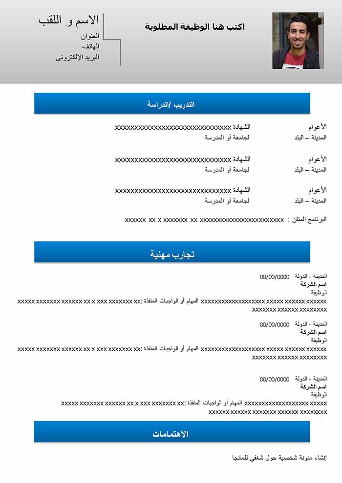 هذا نموذج من السيرة الذاتية مجاني و قابل للتحميل و التعديل مثالي لكل نوع من ملفات الوورد . تسليط الضوء على المهارات سيمثل ميزة مهمة . سواء كنت طالب ، مدير أو موظف، هذا النموذج من السيرة الذاتية المجاني قادر بالتأكيد على التأقلم مع احتياجاتك. هذا النوع من السير الذاتية مثالي لتقديم تجاربك المهنية. كما يحتوي أيضاً على فقرة في أعلى السيرة الذاتية للإشارة إلى نقاط قوة ملفك. فكر في اختيار عبارة لفت إنتباه جيدة لبدء هذه الفقرة. و إذا كنت ترغب في الحصول على سيرة ذاتية باللغة الإنجليزية، قم بتنزيل هذه السيرة الذاتية و ترجمة الأقسام المختلفة.