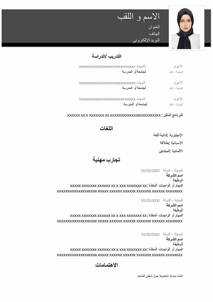 هذا نموذج من السيرة الذاتية مجاني و قابل للتحميل و التعديل مثالي لكل نوع من ملفات الوورد . تسليط الضوء على المهارات سيمثل ميزة مهمة . سواء كنت طالب ، مدير أو موظف، هذا النموذج من السيرة الذاتية المجاني قادر بالتأكيد على التأقلم مع احتياجاتك. هذا النوع من السير الذاتية مثالي لتقديم تجاربك المهنية. كما يحتوي أيضاً على فقرة في أعلى السيرة الذاتية للإشارة إلى نقاط قوة ملفك. فكر في اختيار عبارة لفت إنتباه جيدة لبدء هذه الفقرة. و إذا كنت ترغب في الحصول على سيرة ذاتية باللغة الإنجليزية، قم بتنزيل هذه السيرة الذاتية و ترجمة الأقسام المختلفة.