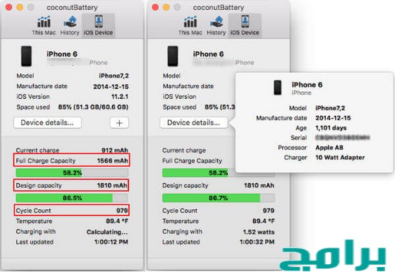 يمكنك ان تعتمد على هذا التطبيق المخصص لأجهزة ماك للتحقق من بطارية الآيفون. أولا، قم بتحميل وتشغيل تطبيق coconut Battery على جهاز ماك لاختبار بطارية ماك آبل. للتحقق من بطارية الآيفون، لديك قم بتوصيل جهاز الآيفون مع جهاز ماك عبر الكابل . بعد توصيل ايفون إلى ماك بالكابل، انقر على قائمة جهاز iOS علي ماك وفتح التطبيق لرؤية الكثير من المعلومات المفيدة حول جهاز الآيفون الخاص بك علي الشاشة .