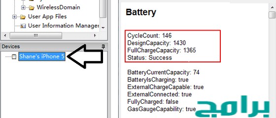 الآن، انقر على أيقونة الهاتف لتحديد ايفون من القائمة وانقر على مزيد من المعلومات لعرض تفاصيل بطارية الآيفون الخاص بك. ويشتمل البرنامج علي عدد المرات البطارية مشحونة وتفريغها في كامل عمر اي فون. وكذلك يشير البرنامج الي مستوي اداء البطارية وكم الطاقة المتاحة في البطارية وغيرها من المعلومات .