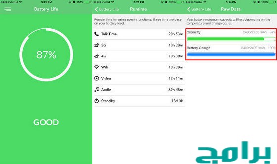 هذا التطبيق جيد في حساب البيانات ، ورصد وقت تشغيل الآيفون، ويظهر التطبيق القدرة الإجمالية للبطارية وقدرة الآيفون علي شحن البطارية ، بالرغم من ذلك فإن هذا التطبيق لا يظهر دورة الحياة الكاملة من بطارية الآيفون .
